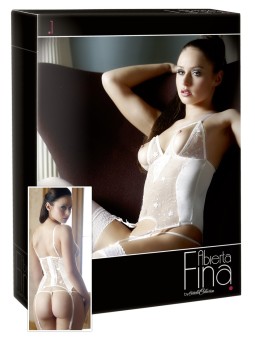 Guepierre bianca by Abierta Fina. Delicato e sexy completo, ricamato in rete fina e raso stretch. Sexy perizoma completamente ricamato, con cavallo aperto, aperture sui seni, chiusura con ganci sulla parte posteriore, spalline e bretelle per calze regolabili.